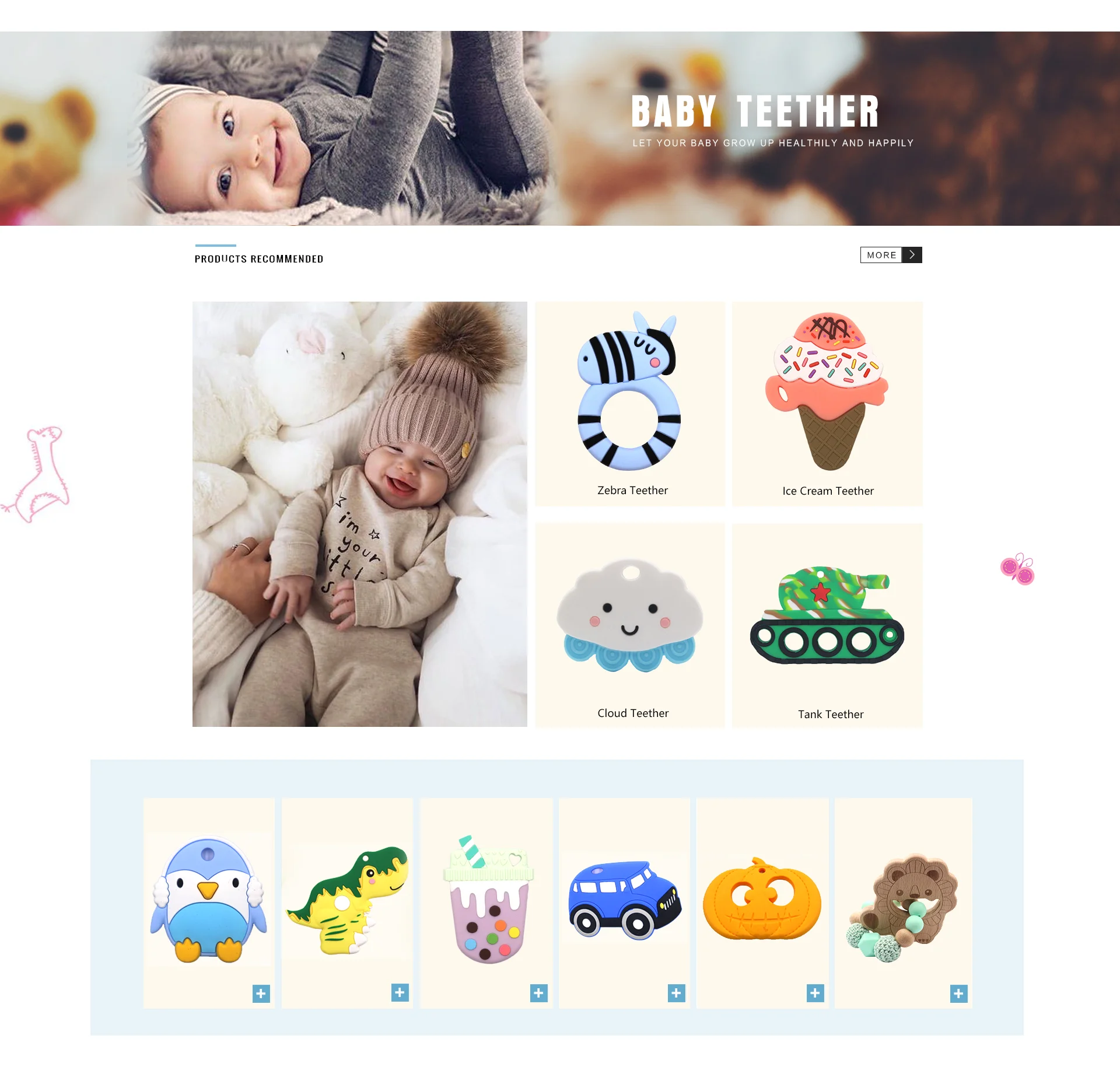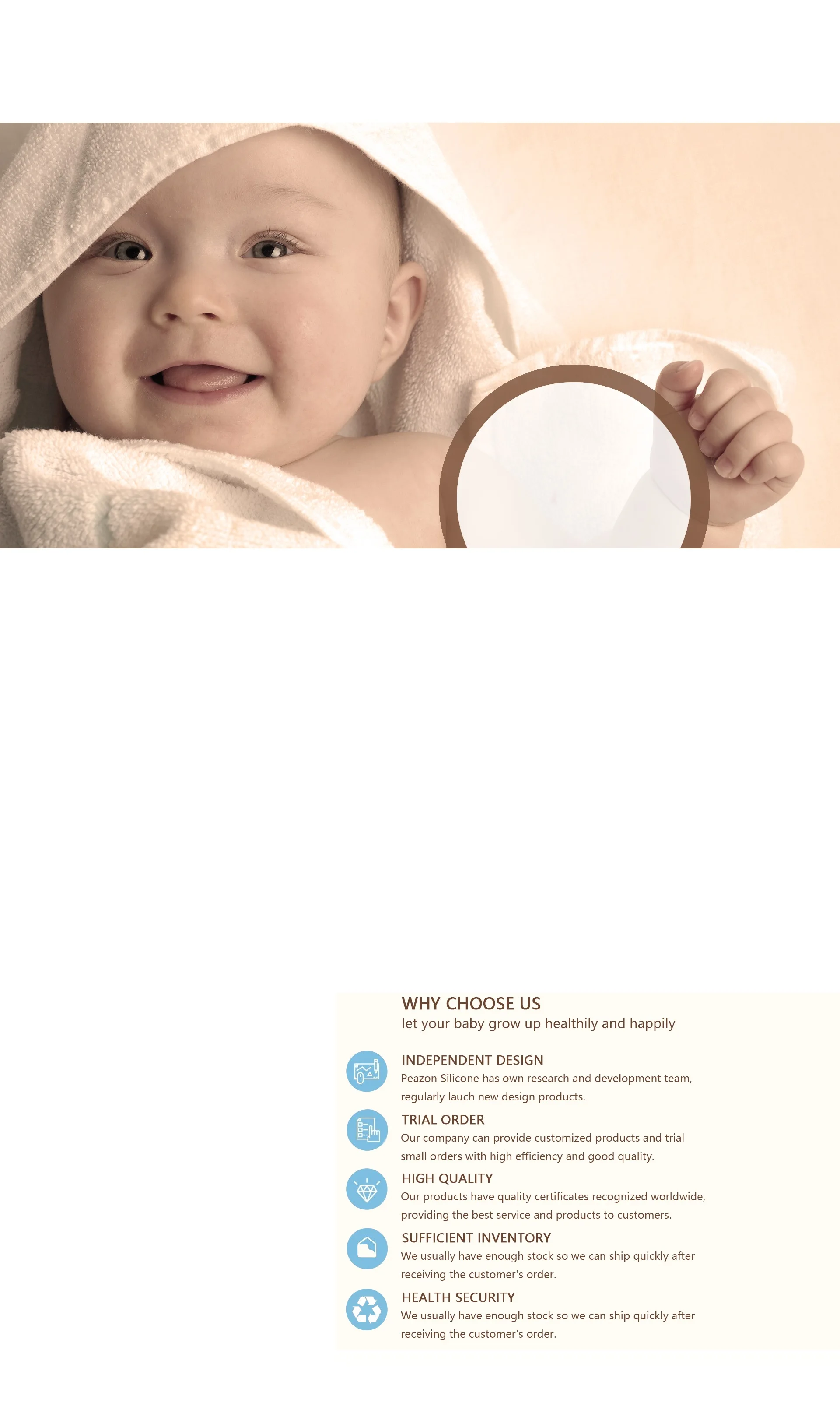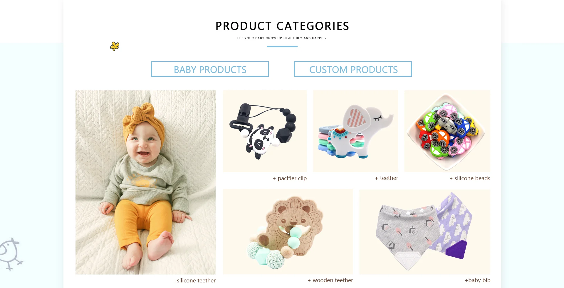 Основные продукты:Силиконовый детский прорезыватель, силиконовая бусина, цепочка для соски, детский нагрудник, детская посуда